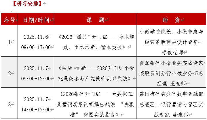 适合对象: 全国各股份制银行、城商行、农商行、农信联社、邮储银行: 1.各行领导,董/理事长、行长/主任、副行长/副主任; 2.总分行管理层,分管普惠、公司业务、零售业务行领导、部门总经理 3.普惠金融部,总经理、副总经理、团队负责人、产品经理 4.信贷管理部,相关负责人及评审人员 5.公司业务部/小微企业部,总经理、客户经理团队 6.网络金融部/数字化转型办公室,相关业务负责人 7.一线分支行,行长、分管副行长、营销团队负责人及客户经理